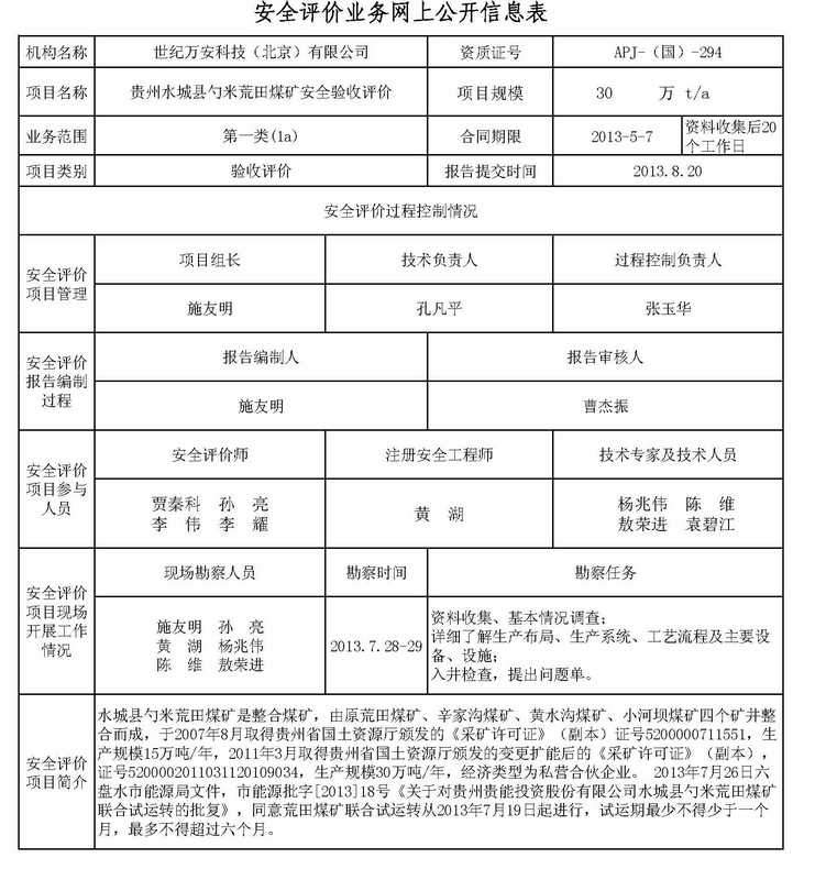 [2013年第3季度]貴州水城縣勺米荒田煤礦安全驗收評價